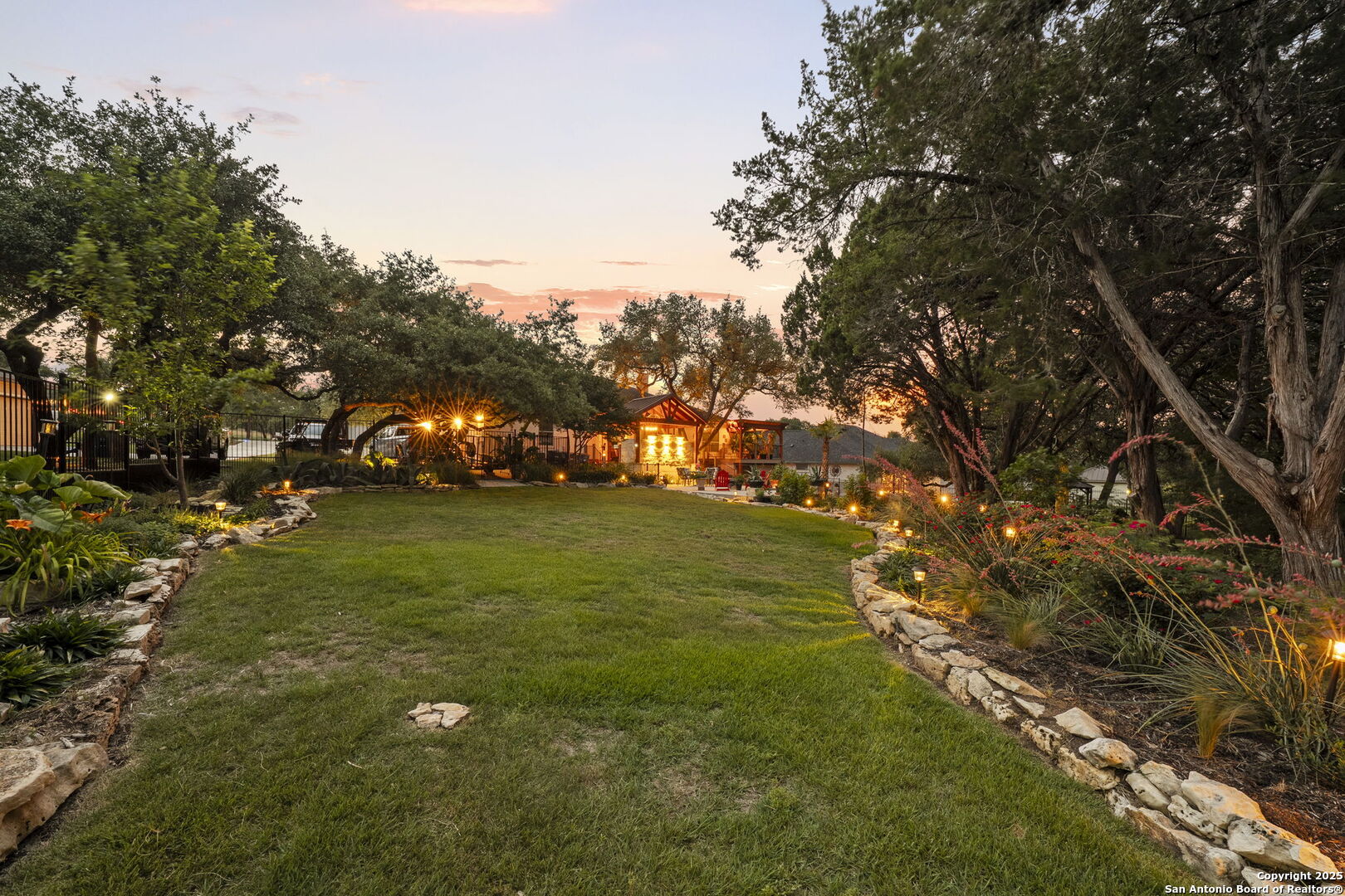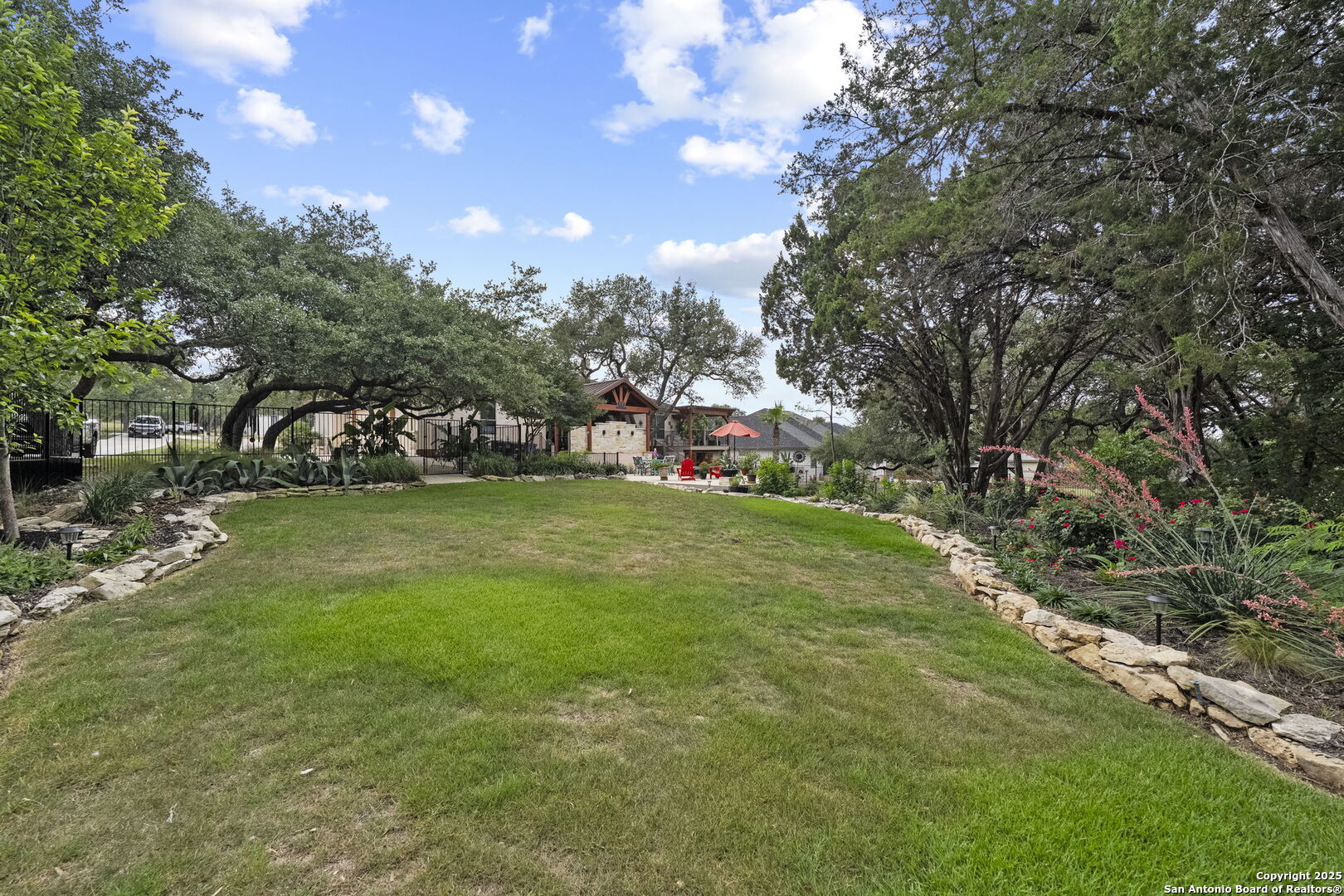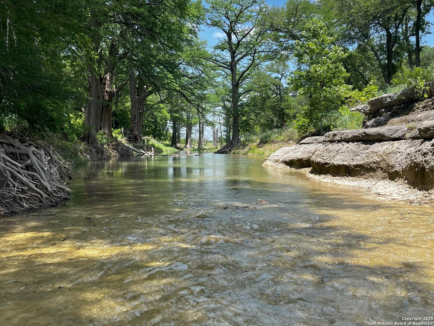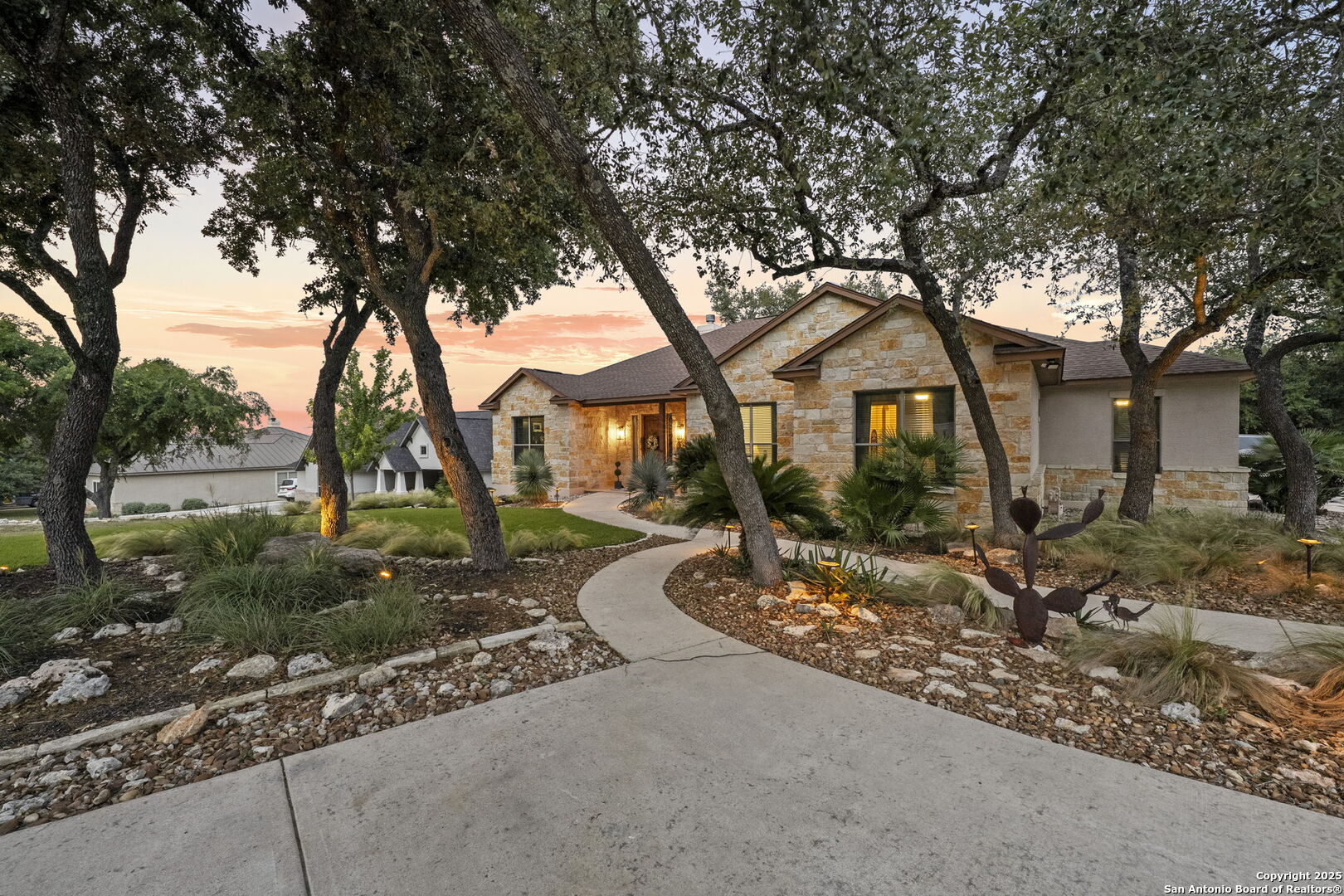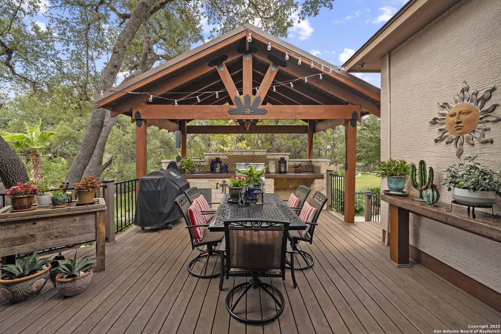 Welcome to this charming 3 bedroom, 2.5 bath home with a dedicated office, spacious master bedroom and master bath with separate shower and tub, nestled in the highly sought after, gated community of Las Brisas at Canyon Lake. This property features beautifully designed landscaping with a well manicured lawn, mature trees, creating your own peaceful backyard retreat. Enjoy outdoor living with expansive decking, railing to match the rod iron fully fenced backyard, outside kitchen and a spacious covered patio, ideal for entertaining or relaxing in nature. The home also includes a 3-car garage, with the third bay offering ample storage room (10.6 x 8.8) and space for a utility vehicle or golf cart. Inside, the thoughtfully designed layout offers the perfect blend of comfort and functionality with a breakfast area featuring a custom built-in bourbon bar open to the kitchen and living area with a touch of stone throughout. Schedule your showing today for this enchanting hill country home located on the south side of the lake. Kitchen refrigerator, washer and dryer convey. Water softener is new, water heater new, new ceiling fans throughout, new gas range,BRAND NEW Trane 14.3 Seer2 4.0 Ton 80% Gas Full System Replacement and septic has updated controller, pump, and floats. There is also extra storage under deck