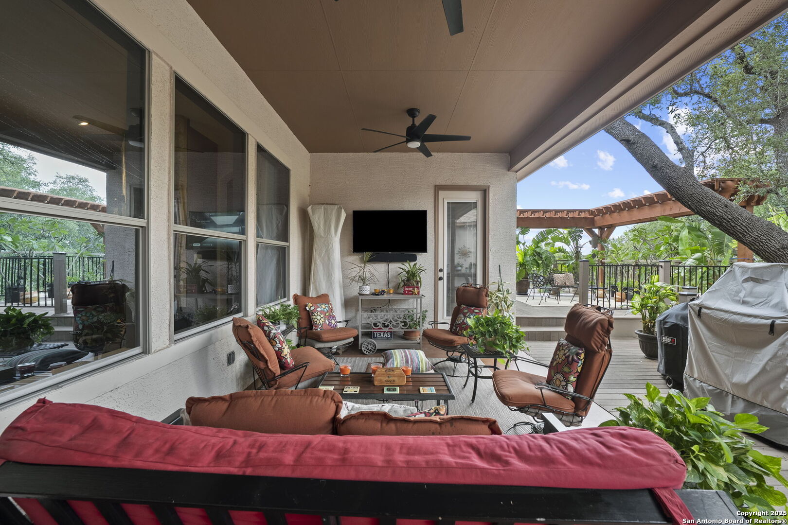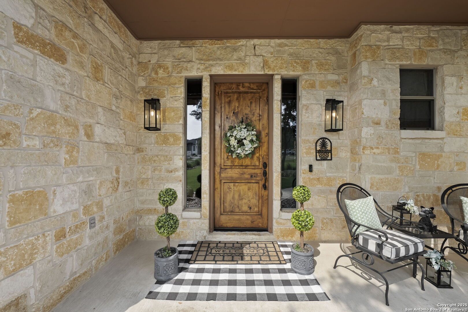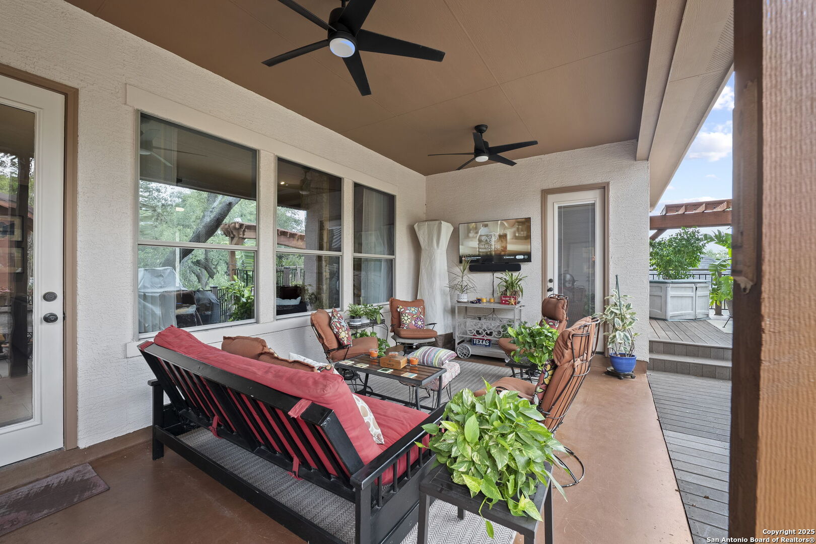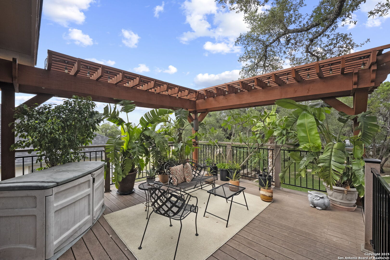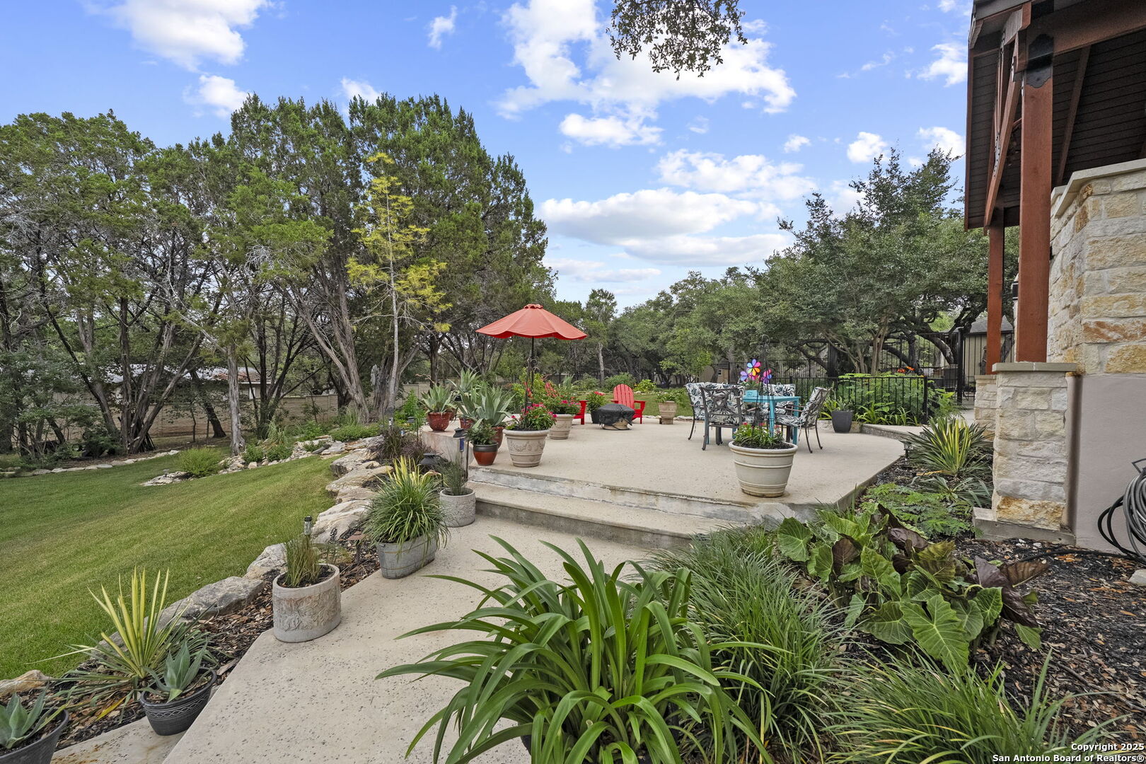 Welcome to this charming 3 bedroom, 2.5 bath home with a dedicated office, spacious master bedroom and master bath with separate shower and tub, nestled in the highly sought after, gated community of Las Brisas at Canyon Lake. This property features beautifully designed landscaping with a well manicured lawn, mature trees, creating your own peaceful backyard retreat. Enjoy outdoor living with expansive decking, railing to match the rod iron fully fenced backyard, outside kitchen and a spacious covered patio, ideal for entertaining or relaxing in nature. The home also includes a 3-car garage, with the third bay offering ample storage room (10.6 x 8.8) and space for a utility vehicle or golf cart. Inside, the thoughtfully designed layout offers the perfect blend of comfort and functionality with a breakfast area featuring a custom built-in bourbon bar open to the kitchen and living area with a touch of stone throughout. Schedule your showing today for this enchanting hill country home located on the south side of the lake. Kitchen refrigerator, washer and dryer convey. Water softener is new, water heater new, new ceiling fans throughout, new gas range,BRAND NEW Trane 14.3 Seer2 4.0 Ton 80% Gas Full System Replacement and septic has updated controller, pump, and floats. There is also extra storage under deck