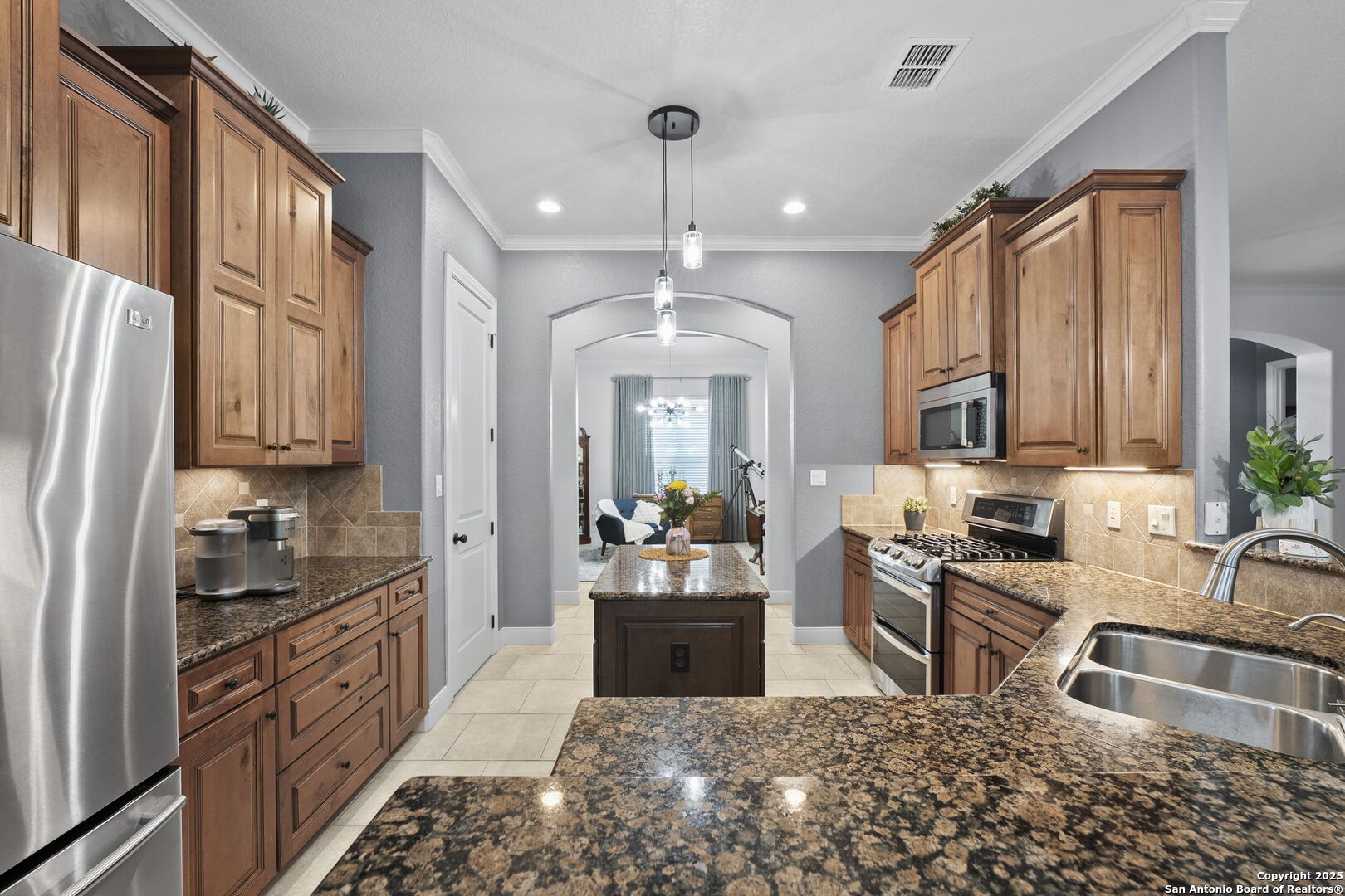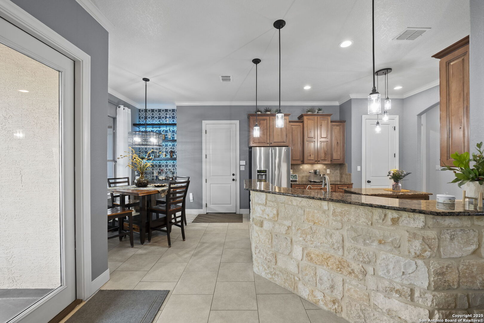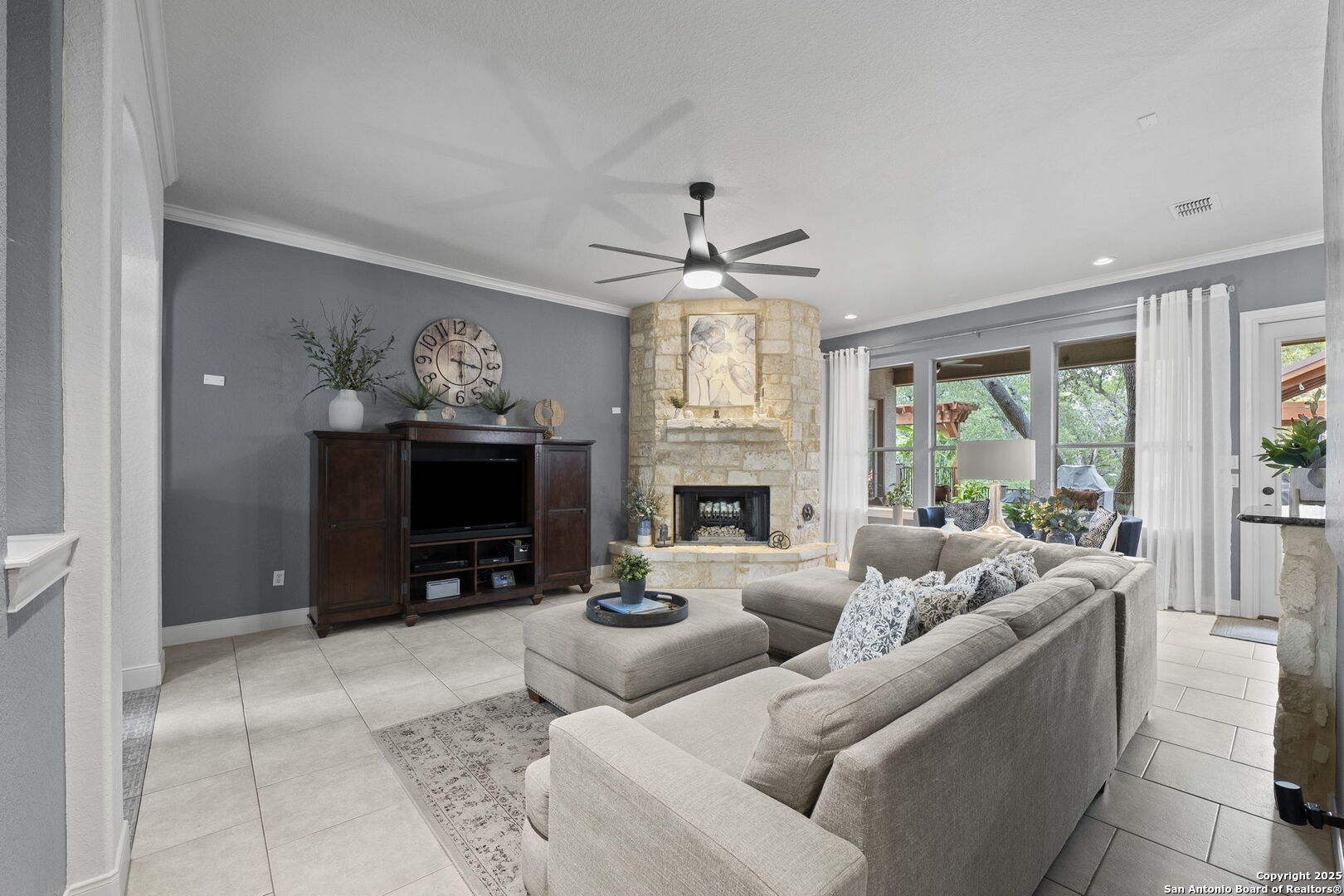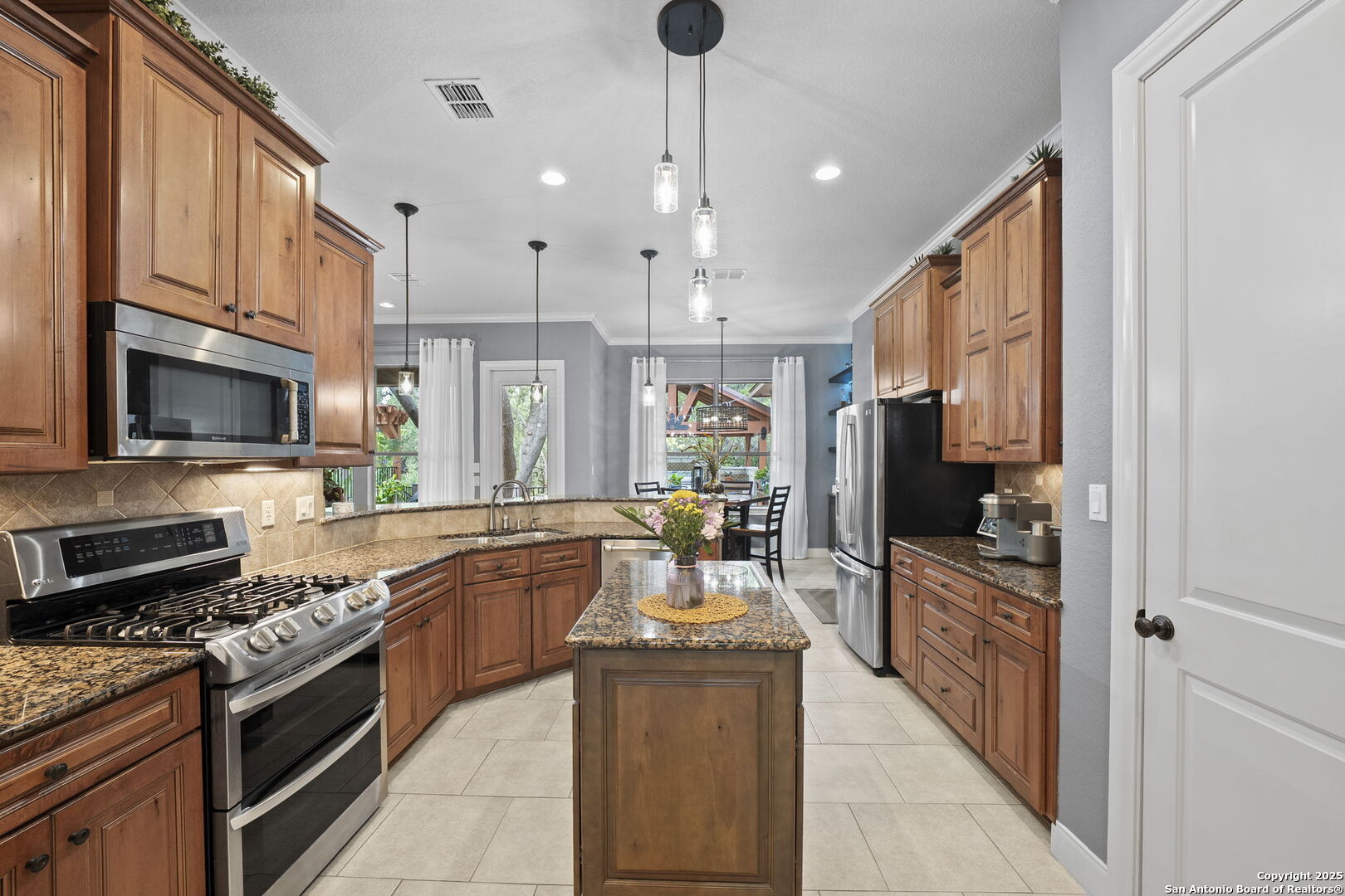 Welcome to this charming 3 bedroom, 2.5 bath home with a dedicated office, spacious master bedroom and master bath with separate shower and tub, nestled in the highly sought after, gated community of Las Brisas at Canyon Lake. This property features beautifully designed landscaping with a well manicured lawn, mature trees, creating your own peaceful backyard retreat. Enjoy outdoor living with expansive decking, railing to match the rod iron fully fenced backyard, outside kitchen and a spacious covered patio, ideal for entertaining or relaxing in nature. The home also includes a 3-car garage, with the third bay offering ample storage room (10.6 x 8.8) and space for a utility vehicle or golf cart. Inside, the thoughtfully designed layout offers the perfect blend of comfort and functionality with a breakfast area featuring a custom built-in bourbon bar open to the kitchen and living area with a touch of stone throughout. Schedule your showing today for this enchanting hill country home located on the south side of the lake. Kitchen refrigerator, washer and dryer convey. Water softener is new, water heater new, new ceiling fans throughout, new gas range,BRAND NEW Trane 14.3 Seer2 4.0 Ton 80% Gas Full System Replacement and septic has updated controller, pump, and floats. There is also extra storage under deck