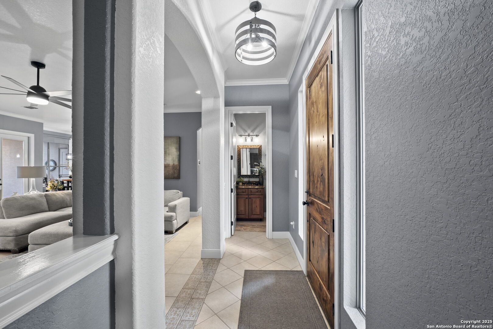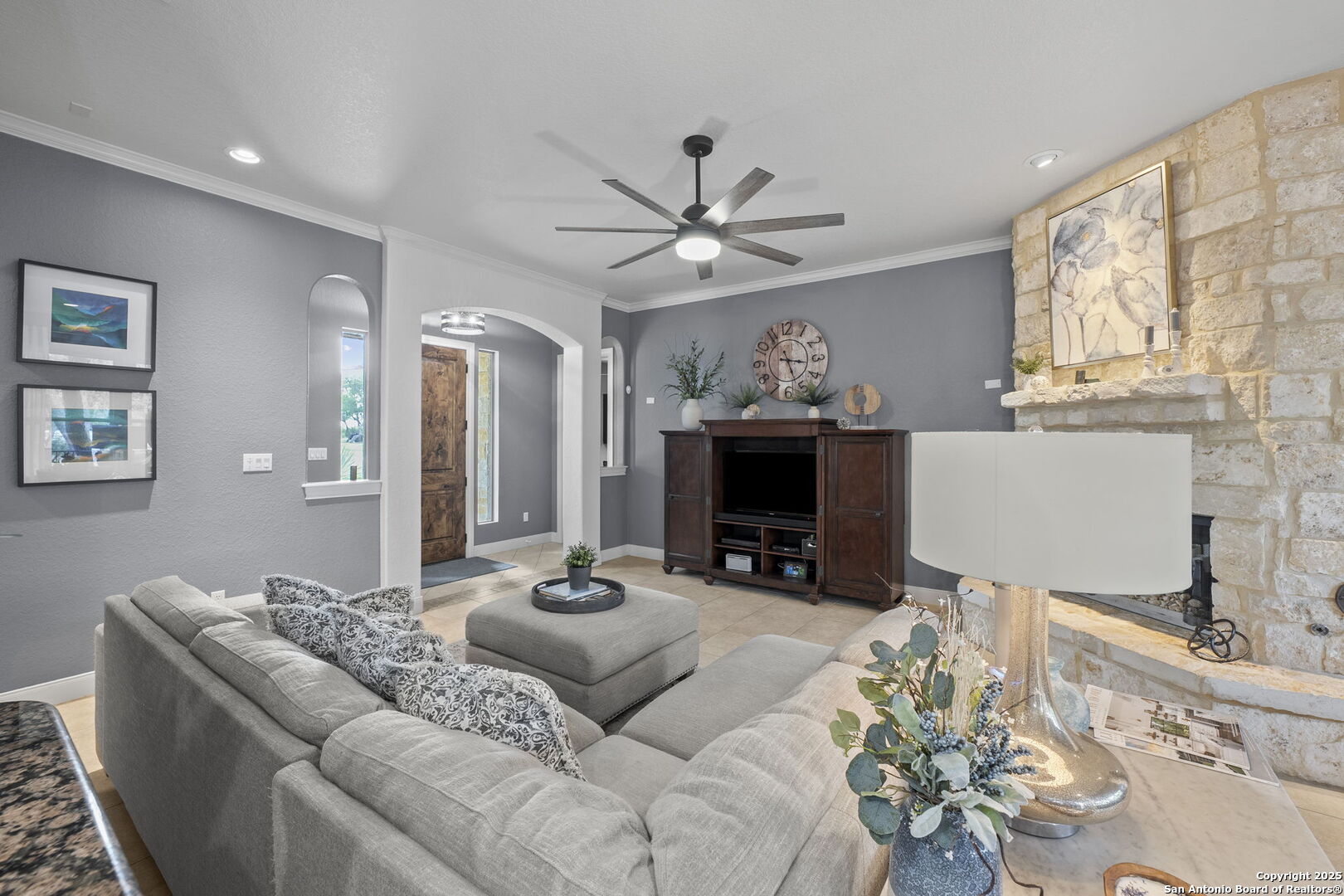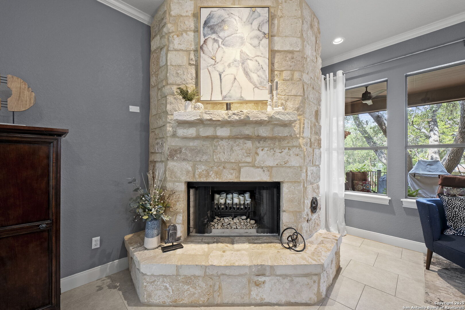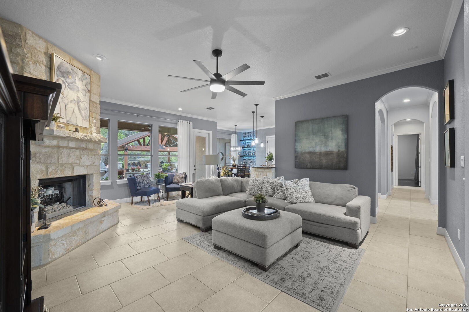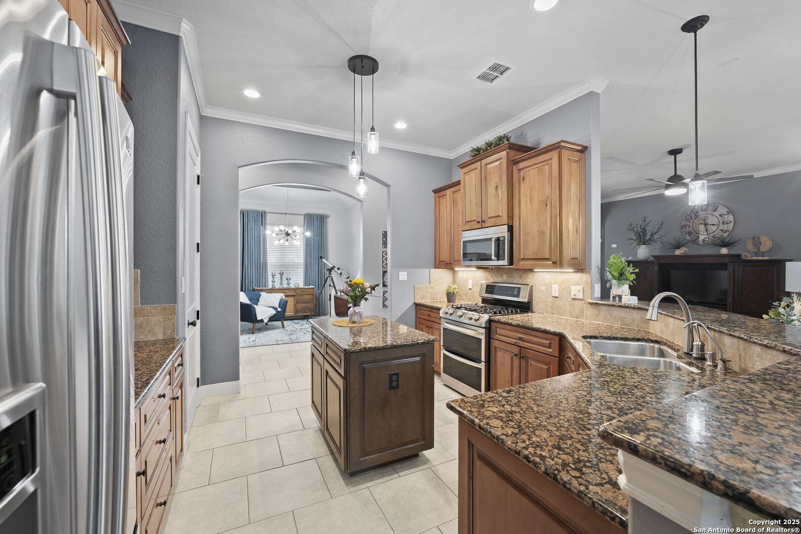 Welcome to this charming 3 bedroom, 2.5 bath home with a dedicated office, spacious master bedroom and master bath with separate shower and tub, nestled in the highly sought after, gated community of Las Brisas at Canyon Lake. This property features beautifully designed landscaping with a well manicured lawn, mature trees, creating your own peaceful backyard retreat. Enjoy outdoor living with expansive decking, railing to match the rod iron fully fenced backyard, outside kitchen and a spacious covered patio, ideal for entertaining or relaxing in nature. The home also includes a 3-car garage, with the third bay offering ample storage room (10.6 x 8.8) and space for a utility vehicle or golf cart. Inside, the thoughtfully designed layout offers the perfect blend of comfort and functionality with a breakfast area featuring a custom built-in bourbon bar open to the kitchen and living area with a touch of stone throughout. Schedule your showing today for this enchanting hill country home located on the south side of the lake. Kitchen refrigerator, washer and dryer convey. Water softener is new, water heater new, new ceiling fans throughout, new gas range,BRAND NEW Trane 14.3 Seer2 4.0 Ton 80% Gas Full System Replacement and septic has updated controller, pump, and floats. There is also extra storage under deck