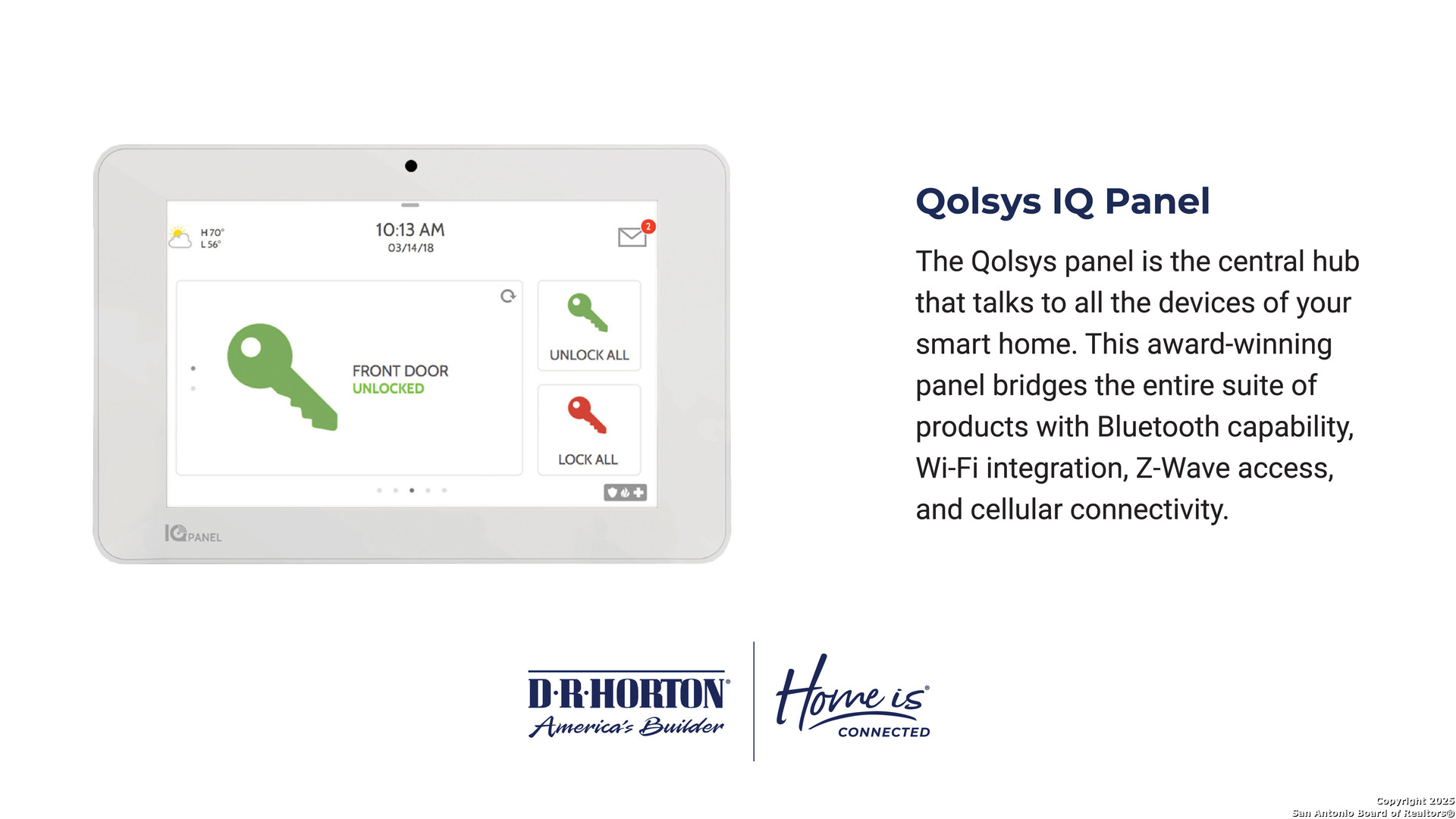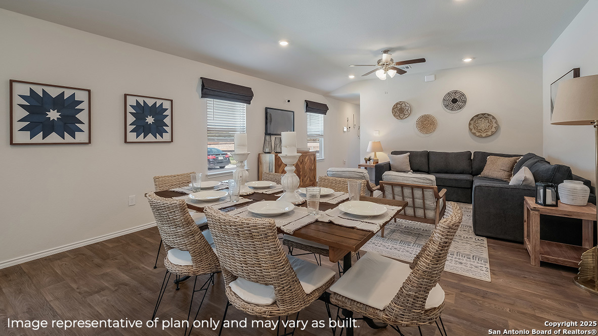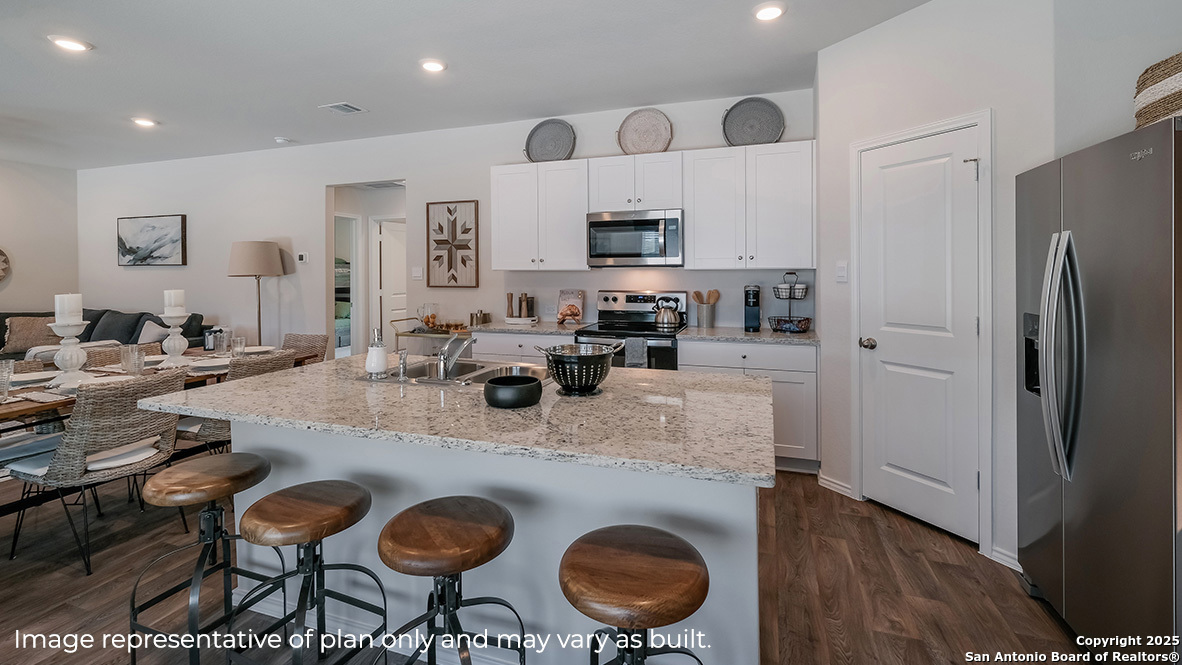 The Diana plan is our largest one-story home offered at Stonehill in San Antonio, TX. Featuring 2 classic front exteriors, 3 bedrooms, 2 baths, 2-car garage and 1535 square feet of living space, this floor plan is sure to turn heads. Comfort greets you at the door with a long foyer leading to a combined living and dining area, then flowing into the grand corner kitchen. The kitchen includes a breakfast bar with beautiful quartz counter tops, stainless steel appliances, shaker style cabinetry and a corner pantry with built-in shelving. Your blended family room and dining area feature quality sheet vinyl flooring and plenty of windows, creating a light and bright space for living and entertaining. The main bedroom is located at the back of the home and has its own attached bathroom that offers a separate water closet, tiled walk-in shower and spacious walk-in closet. All secondary bedrooms offer quality carpeted floors and a closet. These rooms are versatile. Use them as bedrooms, offices, work out rooms or other bonus spaces. The Diana floor plan also includes quartz countertops in all bathrooms, full yard landscaping and irrigation, and our HOME IS CONNECTED base package. Using one central hub that talks to all the devices in your home, you can control the lights, thermostat and locks, all from your cellular device.