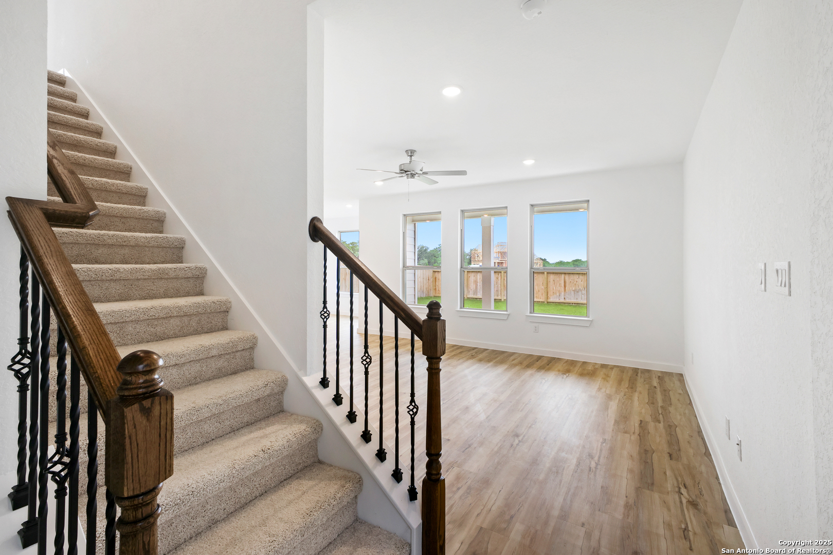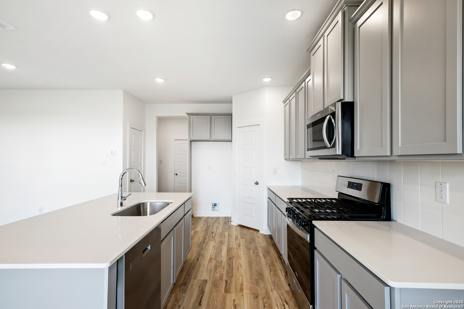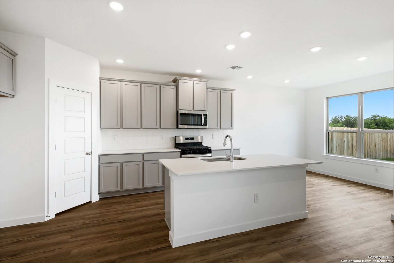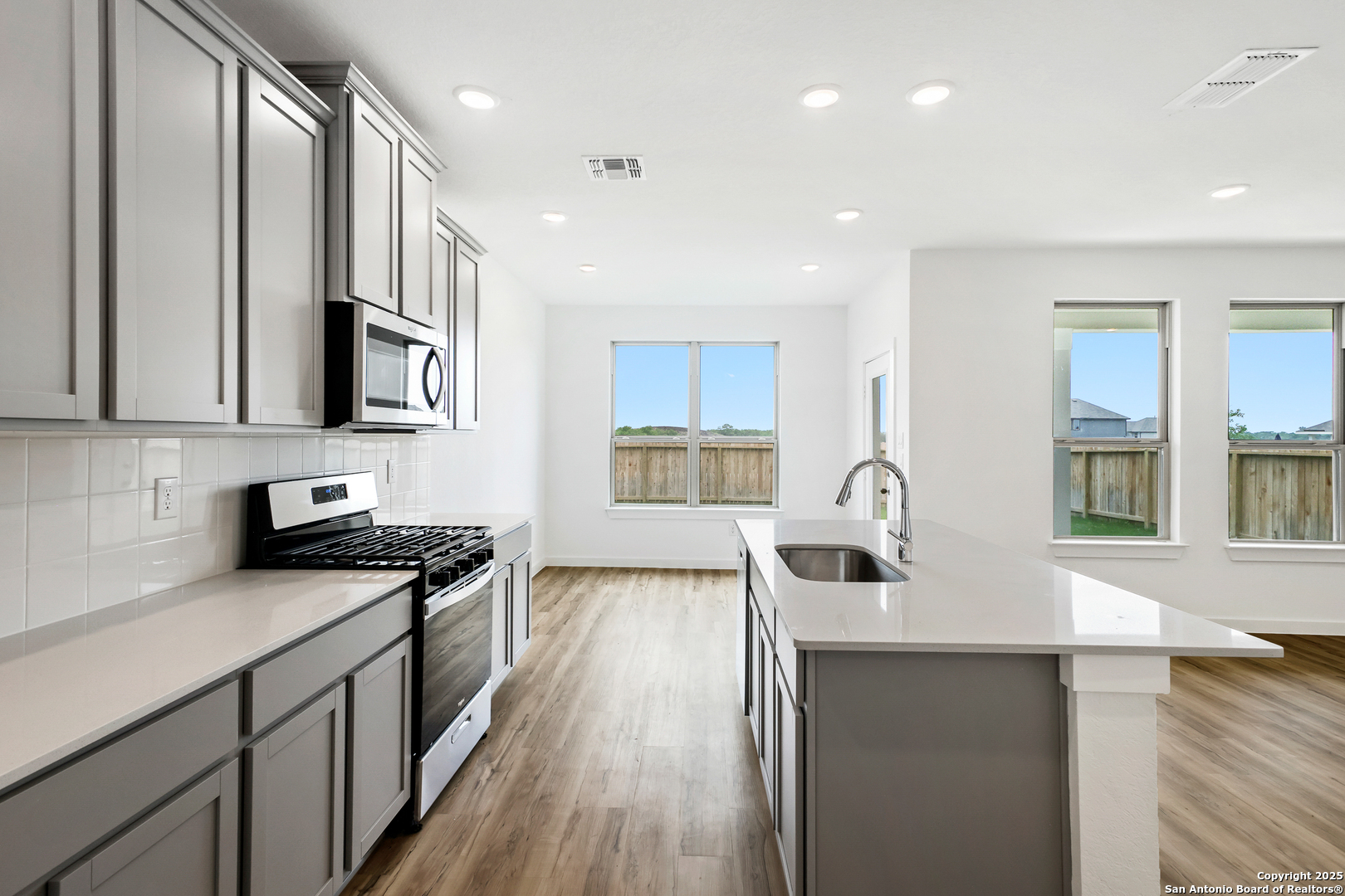 MLS# 1824467 – Built by HistoryMaker Homes – Ready Now! ~ Welcome to your dream home nestled in the picturesque community of Morgan Meadows on the northwest side of San Antonio. This charming abode boasts 3 bedrooms, 2.5 bathrooms, and a generous 1962 square feet of living space, ensuring comfort and style for you and your family. As you step onto the property, you’re greeted by a lush green lawn and a meticulously maintained landscaping, enhanced by a convenient sprinkler system both in the front and back yards. Enjoy the serene peace of having no neighbors behind your home. The oversized patio beckons for leisurely afternoons or outdoor gatherings with friends, promising delightful moments under the Texas sun. Upon entering the home, you’ll immediately notice the modern and sophisticated design featuring black fixtures throughout, adding a touch of elegance to every corner. The open concept kitchen is a culinary enthusiast’s dream, equipped with sleek stainless steel appliances, a gas stove for precision cooking, and stunning quartz countertops that seamlessly blend beauty with functionality. Ascending to the second floor, the oversized primary bedroom awaits, offering a serene retreat after a long day. This spacious sanctuary boasts not one, but two closets, ensuring ample storage space for your wardrobe and personal belongings. Outside of your personal oasis, the Morgan Meadows community offers an array of amenities to enrich your lifestyle. Take a refreshing dip in the sparkling swimming pool, challenge friends to a game of pickleball on the court, or watch little ones laugh and play on the playground-there’s something for everyone to enjoy. With its perfect blend of comfort, convenience, and luxury, this home in Morgan Meadows is more than just a place to live-it’s a haven where memories are made and cherished for years to come.